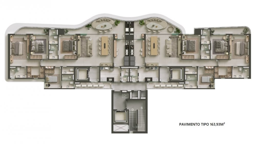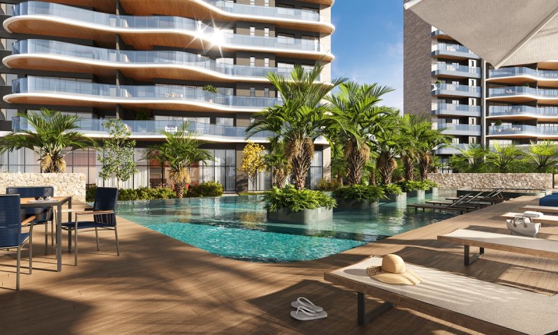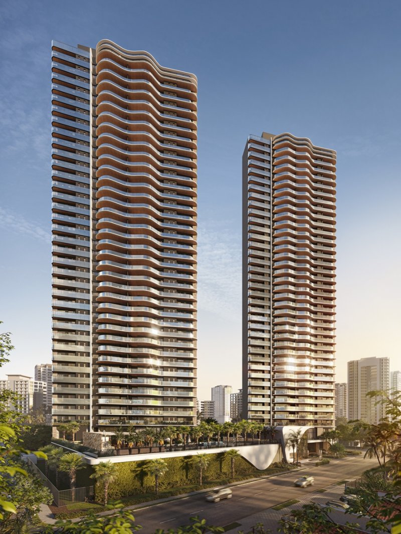 Condomínio com 2 torres de 35 andares, a Torre Bertrand com 203,75m² e 4 vagas de garagem e a Torre Arisa com 163,93m² e 3 vagas de garagem , 4 suítes com frente nascente.